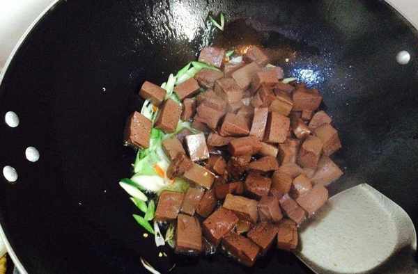 (7)烹辣椒段,葱花,蒜末,放料酒,放猪血翻炒;