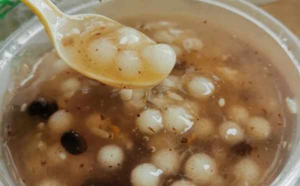 阿婆們配合默契,分工明確,不到一分鐘就能做好一個烏飯團,可仍然無法滿足這麼多客人的要求,如果來晚了烏飯團,就賣光了,他家的烏飯團裡面加油條,有嫩油條和老油條之分,可以自己選擇,另外人氣比較高的就是酒釀元宵,適合老人小孩吃,而且酒釀的味道很淡。