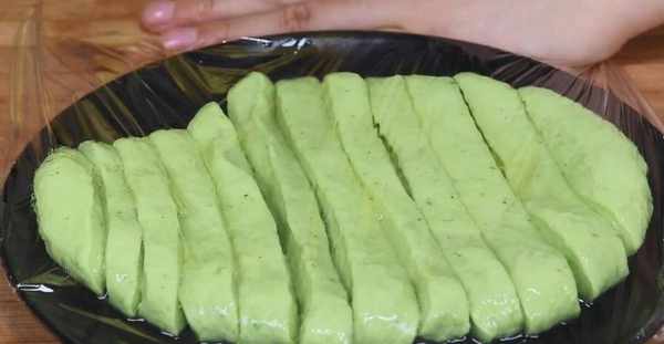 6.取出菜刀,将面皮给切成一道一道的长条,宽度要差不多一样。准备一个盘子,给盘子上面刷上一层食用油,把面条放在盘子上面,然后再给面条上刷上一层食用油,接着,给盘子上裹上一层保鲜膜,让面条在里面饧发40分钟。