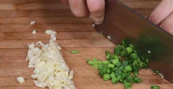 7. 去几个大蒜,用菜刀的刀背将大蒜给拍破,这样就能很容易的把蒜皮给剥掉了。接着,把剥完皮的蒜放在案板上,用菜刀来来回回的切,直到切成蒜沫子。准备两根清洗干净的小葱,控干水后切成葱花。把蒜沫和葱花放在控碗里待用。