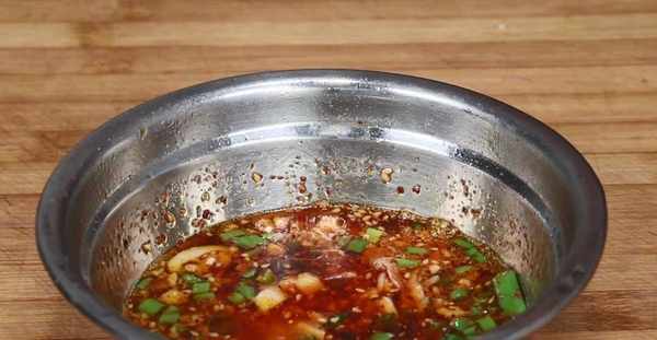 8.舀一勺子干辣椒面放进蒜沫葱花碗里,再加入一些白芝麻。起锅烧油,等锅中的油温升至9成热了,关火。马上将锅中的热油淋到碗中,用筷子搅动热油,要将碗中的调料给激发出香味来。接着,再加入食盐和白糖,还要倒进去生抽和蚝油,用筷子搅拌均匀后待用。