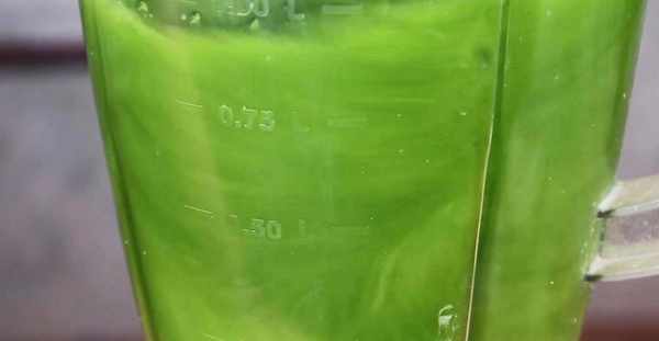2.取出家里的榨汁机,打开盖子,将韭菜段全部放进榨汁机里,再加一点清水进去,盖上盖子,打开开关,将韭菜给打成韭菜汁。打好之后,关闭电源,让韭菜汁在榨汁机中,待用。