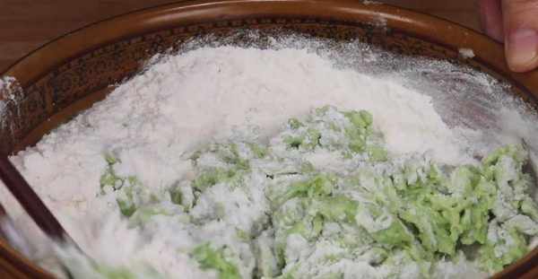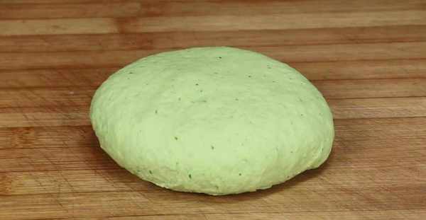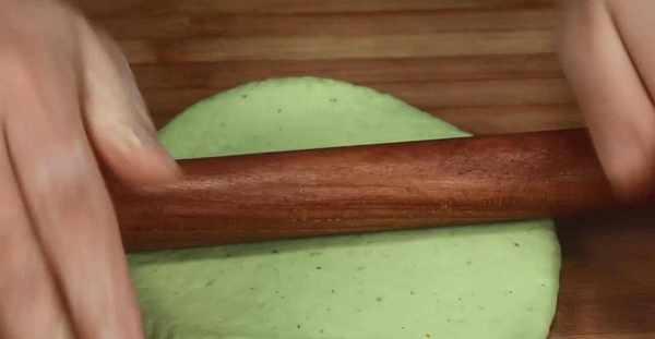 4. 接着,就开始下手揉面了。从面盆中间面絮多的地方开始揉面,用揉、压、搓等方法,让面絮和周围的干面粉揉在一起,慢慢的就将碗中所有的面粉给揉成一个绿色的大面团了。揉好后,将面团拿出来,放在案板上再揉1分钟。