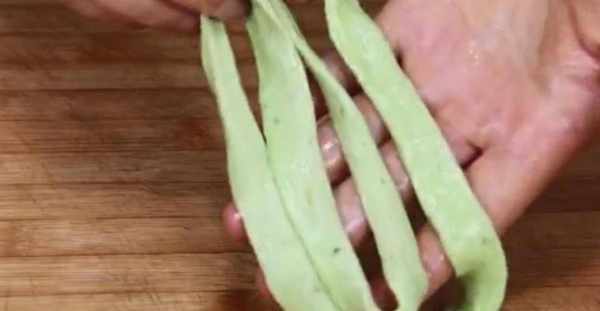 9.时间到,面条就饧发好了。取出一根面条,放在案板上,用手指将面条压扁,然后扥住两头,一边摔打,一边往两边扯,把面条给扯成长面。把所有的面条都扯成面条,待用。