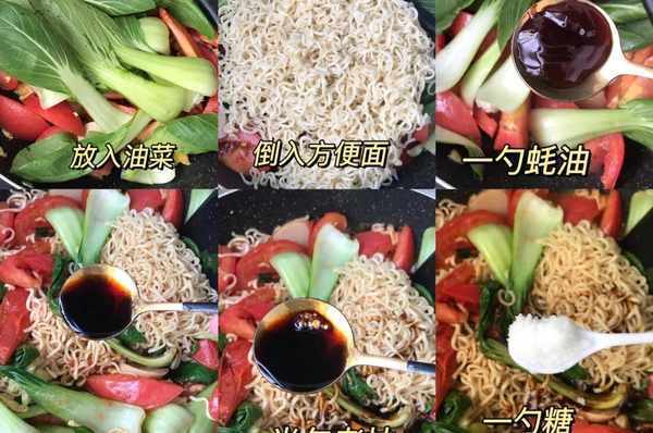 食材:方便面、番茄、鸡蛋、火腿肠、油菜、葱、蒜、蚝油、生抽、糖、盐、鸡精、番茄酱;