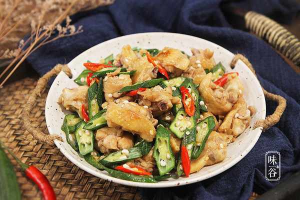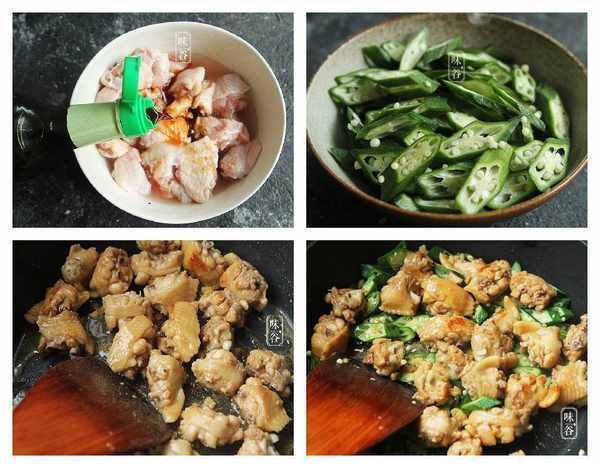 【食材】:秋葵 适量、生抽 2勺、胡椒粉 少许、辣椒 适量、鸡肉 适量、蚝油 1勺、盐 少许、姜蒜适量、料酒 1勺、香油 1小勺、