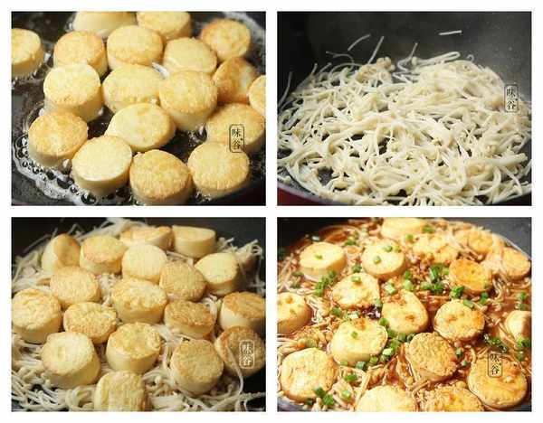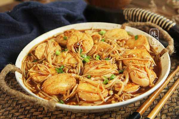 【食材】:金针菇 适量、淀粉 1小勺、日本豆腐 适量、盐 少许、老抽 1勺、蚝油 1勺、生抽 2勺、葱蒜 适量、
