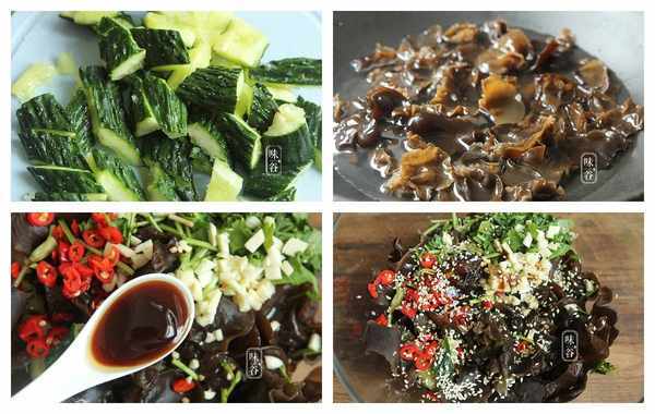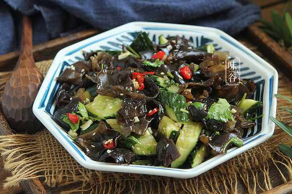 【食材】:干木耳 适量、蚝油1勺、黄瓜 适量、香醋2勺、白糖1小勺、小米椒 适量、香油 1勺、生抽2勺、香菜 少许、蒜 3瓣、