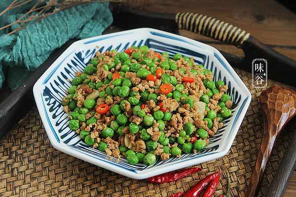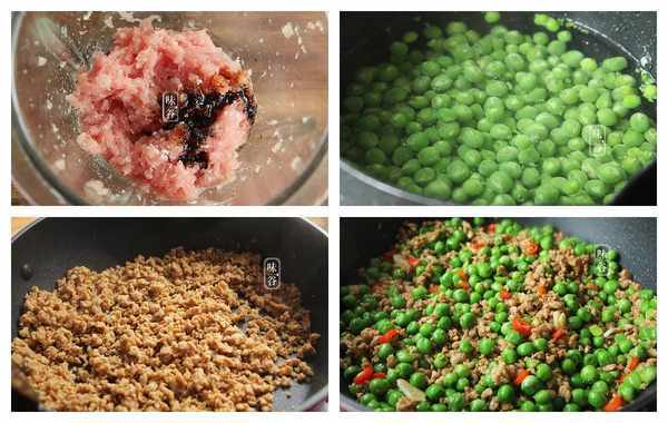 【食材】:豌豆 适量、老抽 1勺、盐 1小勺、肉末 适量、蚝油 1勺、生抽 1勺、淀粉 1小勺、葱姜蒜末 适量、