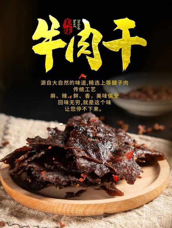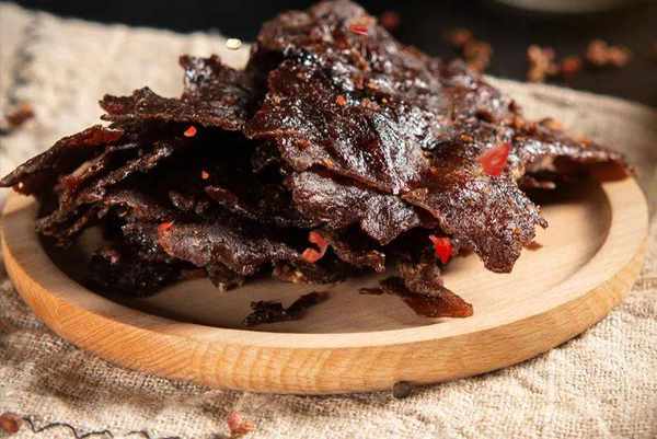 百候牛肉干做法:将剔去骨的新鲜牛肉切成十克左右的大块,放入锅中加少许盐煮至七八成熟,捞出晾凉后切为厚0.2 ~0.3 厘米的大薄片。汤锅中加适量料酒、酱油、红糖以及用纱布包好的桂皮、花椒、大小茴香、姜片等调料,烧沸后放入切好的牛肉片,旺火煮30分钟,捞出沥去水分,用电烤箱(或炭火)烘干即可食用,如煮肉时味不佳,烘烤时可撒些五香粉、味精等调料。用此法制的牛肉干,香味浓郁,口感良好。
