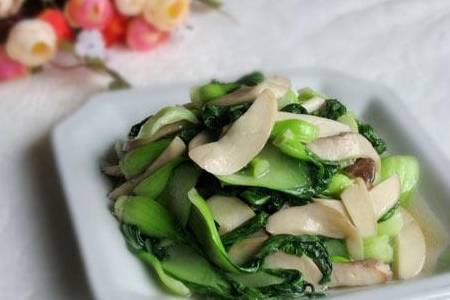 3然后放入青菜煸炒,放少许盐,再放入少许糖,最后放少许鸡精翻炒均匀即可