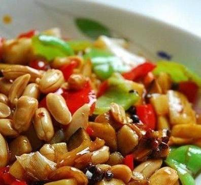 4最后倒入花生米,加盐、豆瓣酱和青蒜苗即可。