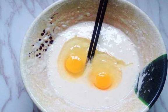 一、将面粉用过滤筛过一遍,随后用适量清水和成糊,打入两个鸡蛋充分拌匀;