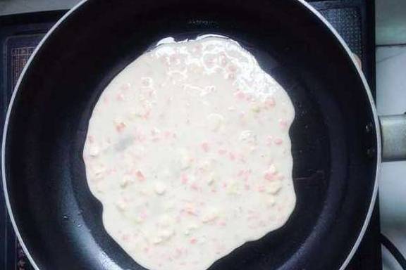 三、不粘锅内倒入适量油,烧热至六七成热时倒入些许拌好的面糊,摊平;