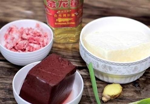 鸭血200克、豆腐200克、肉末60克、生姜一块、青蒜苗一颗、豆瓣酱适量、水淀粉适量、花雕酒少许、金龙鱼1:1:1调和油适量制作步骤:第一步:将鸭血跟豆腐切块,泡入清水中,放入适量的盐,大概10几分钟左右第二步:将泡好的鸭血跟豆腐,放入开水中,煮3分钟左右,捞出即可第三步:起火热油,油热7分时,将切好的蒜末,姜末,豆瓣酱放入炒香