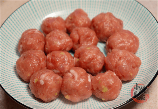 然后再打入半个鸡蛋清,一勺玉米淀粉,直接下手抓拌均匀,把肉馅抓入味。调制好以后的肉馅,我们要用虎口去对它进行挤压,把肉馅挤成一个个的小丸子,再用汤勺给它挖出来备用。