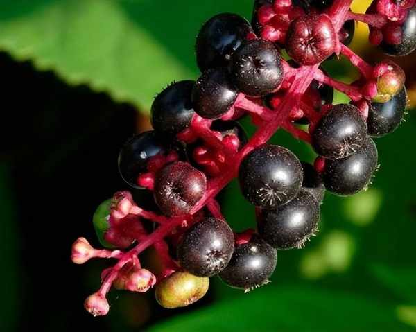它的果实鲜艳欲滴但是没有食用的价值,看上去就和葡萄串一般。我们经常见到的商陆都是红色的茎秆,像这种商陆是不能食用的,但是青色茎秆的商陆嫩叶是上好的美食,可以作为野菜食用。它的果实虽然不能够食用,但是可以提取栲胶,有一定的经济用途,过去还是小孩子们的玩具。