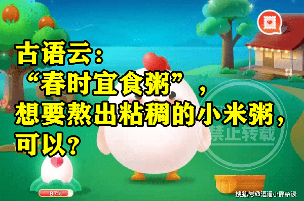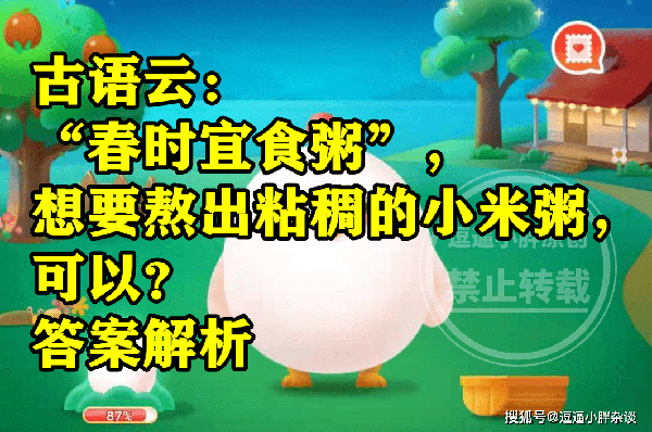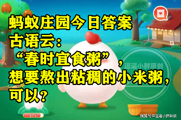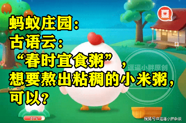 还不清楚,春时宜食粥想要熬出黏稠的小米粥可以干嘛?正确答案的同学,下面就一起来看看,蚂蚁庄园题目:春时宜食粥想要熬出黏稠的小米粥可以干嘛?的正确答案解析吧。