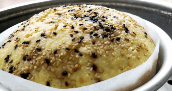3、然后盖上保鲜膜,发酵一个小时左右,时间到,再次搅拌排气,并装入模具中,震出气泡,再撒上黑芝麻点缀。