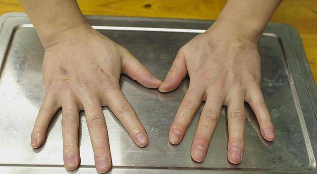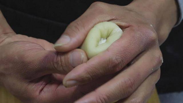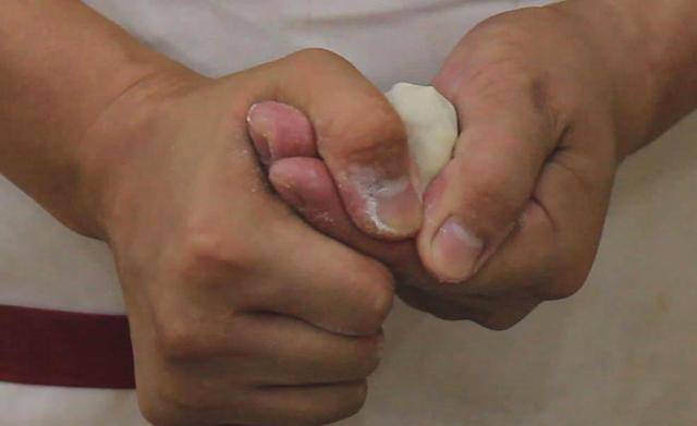 6、全部揉好后,把剂子压成片,用大拇指把面片中心摁压一下,放入一勺糖馅,把面片放在虎口处,不断转动面片,收紧开口,收到最后,揪下一块面团,防止漏糖。剩余剂子都按此步骤做好。