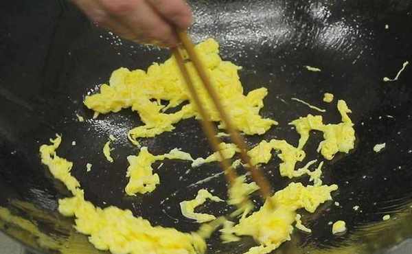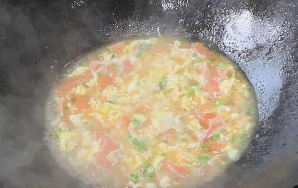 2、锅内烧油,油温5成热时,倒入蛋液,用勺子轻轻翻炒,使蛋液均匀受热,蛋液全部定型后倒入西红柿,炒出汁水,从锅边淋入适量清水。