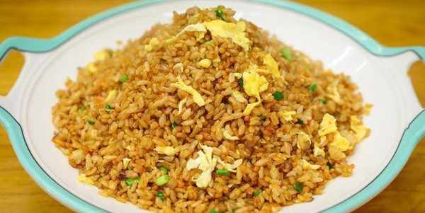 2、炒饭最怕粘锅,一定要先滑锅,热油倒出来重新加凉油,让铁锅具备不粘锅的特。另外打俩鸡蛋倒进去,快速的搅散炒成鸡蛋碎,锅不用洗再加油,把洋葱、胡萝卜爆香,倒入米饭,中小火慢炒。