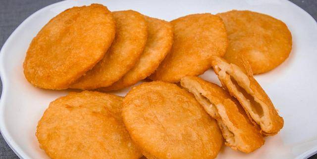 7、面剂都包好糖糕馅后,再给面剂涂一层植物油,案板上再刷油,放上面剂,手上粘油,把面剂压成薄片,小心不要把糖糕馅挤压出来,植物油能使炸出的糖糕起酥,所有的面剂都按此方法处理好。