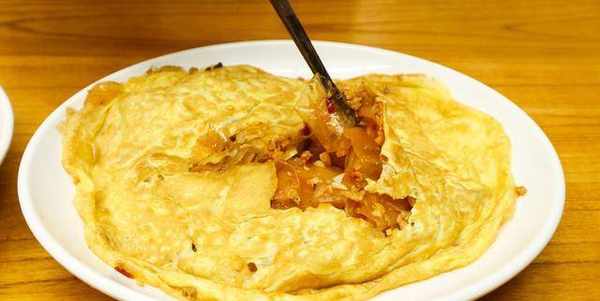 3、粉皮炒好,开始煎鸡蛋,煎这个鸡蛋饼稍微的有一点难度。起锅烧油,把油烧热以后,倒出热油,再加入凉油,再次烧热以后,把油倒出来,锅底不能有油,然后改为小火。