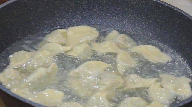 4、烧开水后下入饺子,用勺子轻轻推动,防止粘锅。盖上锅盖,中火煮2分钟,水烧开后淋入少许清水,重复操作三次,饺子口感更加劲道,不易破皮。