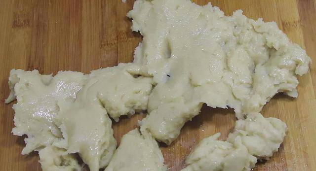 3、用擀面杖继续朝一个方向搅拌摔打,把面团搅到有啪啪的响声,在案板上刷上植物油防粘,把烫好的面团从锅中拿出,用手拉成片状冷却。把面片晾凉后粘上植物油,能使糖糕的外皮起酥。