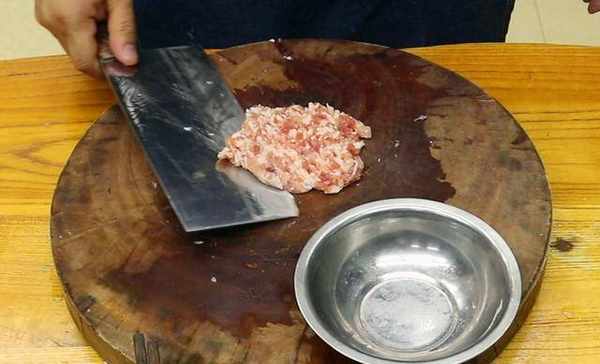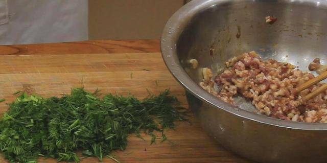 2、洗净的小茴香一把,切碎放在肉馅里,淋入香油,搅拌均匀。香油能锁住馅料水分,使肉馅口感,鲜嫩不出水。