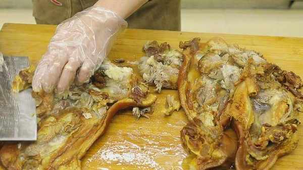 5、把瘦肉先片下来,稍微剁剁,放锅里再炖个五六分钟,多吸点汁,猪脸放托盘里。炖好的猪肉捞出来,摆上面,另一半猪脸一盖一包,用硬物压上几个小时,让它定型。