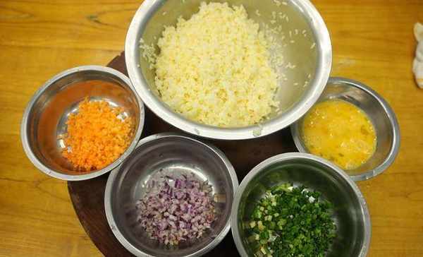 1、晾干水气的米饭,先打进去俩鸡蛋拌拌,提前把米饭抓散,炒起来更方便。葱花、洋葱、胡萝卜碎,小配菜按自己喜好放。