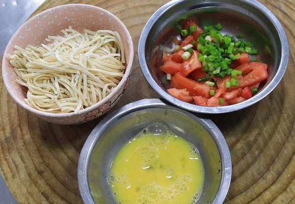 1、西红柿一个,划上十字花刀,热水浸泡1分钟后,放凉后,把外皮剥掉,切成均匀小块备用。小葱两根,切成葱花和西红柿放在一起,在盆中打入一个鸡蛋,搅拌打散,再准备面条200克。