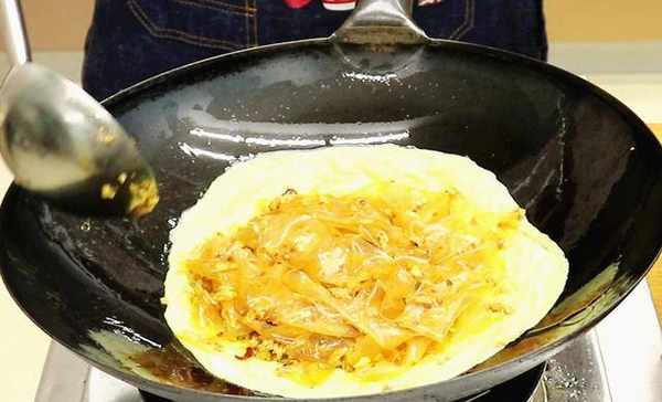 5、在粉皮上再稍微的倒一点鸡蛋,把鸡蛋翻过来。鸡蛋完全的盖在粉皮上,再次转动锅,让粉皮上的鸡蛋也凝固。这个时候就可以出锅了。