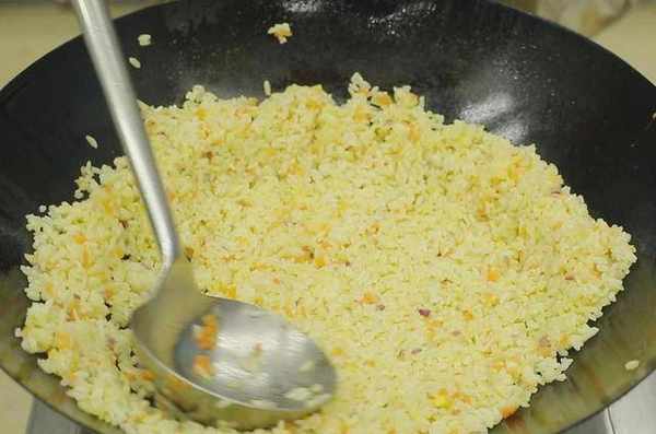 3、时不时沿锅边淋点油,省的粘。慢慢的把米饭里面剩余的水分煸出来,只有把水分炒干米饭才干香筋道、不粘连,闻到米香味以后加盐、鸡粉调味,经常用勺子敲敲,把粘一块的打散。