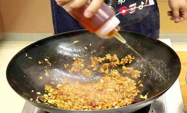 2、起锅烧油,热锅凉油,把肉末翻炒出香味,倒入姜蒜翻炒几下,倒入豆瓣酱,从锅边淋入一点料酒,把豆瓣酱的红油炒出来。倒入粉皮,快速翻炒几下,颜色翻炒均匀就可以出锅了。粉皮不要炒那么久。