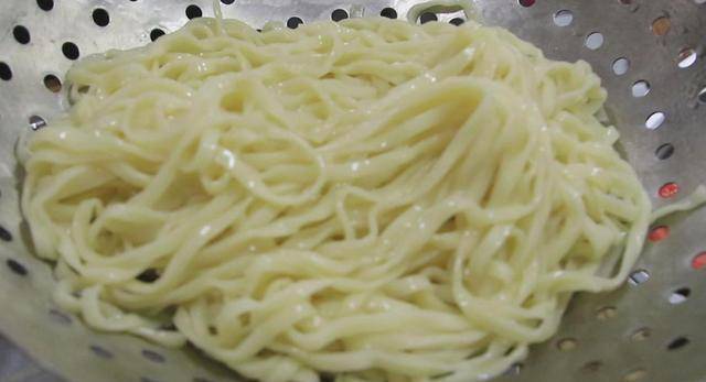 4、锅中加入适量清水,大火烧开,面条下锅后转小火慢煮,面条全部飘起,变成半透明后捞出,把面条放入凉水中过凉,这样吃起来口感更加劲道。