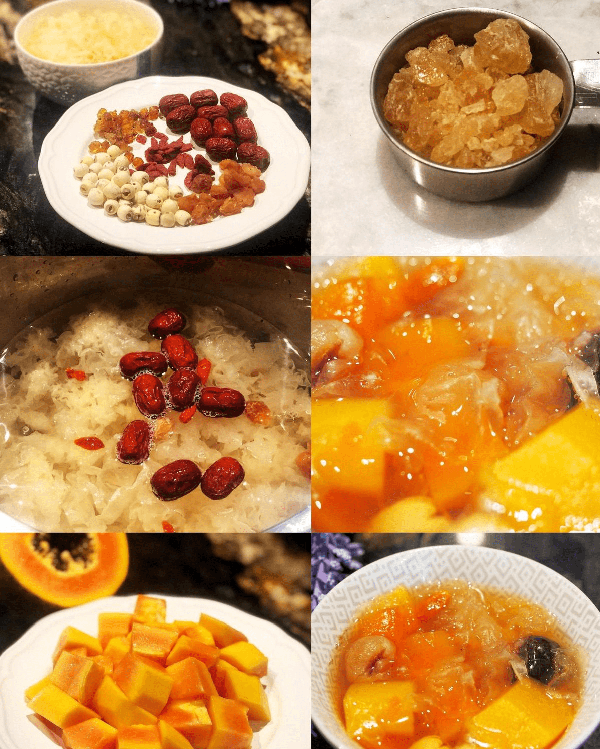 准备食材:银耳一碗,大枣9个,枸杞15粒,莲子20颗,桂圆10个,桃胶10颗,先将银耳泡发起来,之后将大枣,枸杞,莲子,桂圆,桃胶清洗干净之后,一起下入电子高压锅中。接着将泡发好的银耳也放入进来,最后加入2000克的清水,小火慢慢炖煮,开锅中间的时候,将提前切好准备好的300克木瓜,改刀一起下入锅中,最后加入80克冰糖,继续炖煮一共炖煮40分钟就可以了,美味完成。这款羹中,莲子可以养心安神,红枣可以补气血,枸杞能够补肝肾脾胃,是一款十全大补的羹菜。