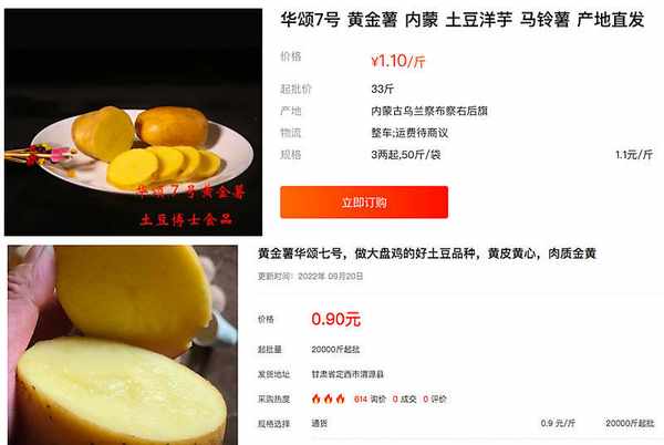 而在一亩田和惠农网上,有商户对华颂7号这一土豆品种的批发报价分别是1.1元/斤和0.9元/斤。
