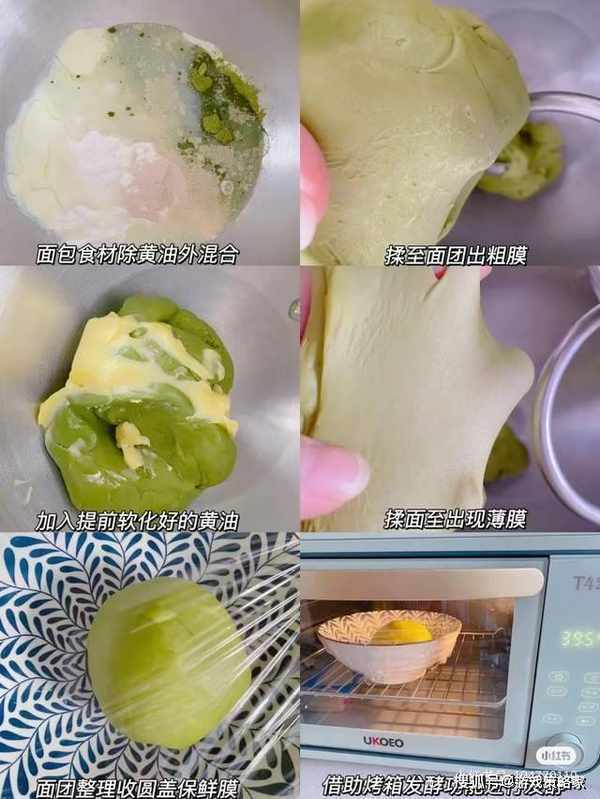 面包食材除黄油外混合,揉面至出粗膜;加入提前软化的黄油,揉面至出现薄膜;面团收圆,借助烤箱发酵