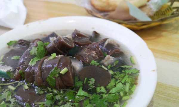 德州的羊肠子是用羊血加入适量的淀粉以及各种作料灌入到羊肠衣当中,然后入锅煮熟。但不少来到德州的外地人表示吃不惯羊肠子,可能也是因为是用羊血制作而成的缘故吧,也可能是因为羊肠子看上去卖相并不好,盛入碗中一块一块的,还被不少人戏称为“黑暗料理”。