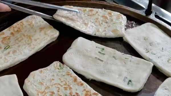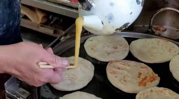 做好的面饼放入煎锅上小火慢煎,慢慢地便会看见煎饼变得鼓涨起来,一面煎制金黄后便可以翻面再煎另一面,这时便用筷子再皮上戳一个洞将鸡蛋灌进去,继续煎一下,最后再烤一下即可出锅,这样的煎饼卖得不贵,几块钱一个,吃进嘴里鸡蛋的香味十足,饼皮外脆里嫩,吃着带有一丝绵劲,口感丰富。