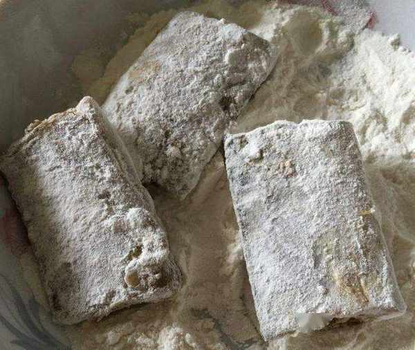 接下来我们准备一个盘子,装上少量的面粉,然后将腌制好的带鱼夹上一块放在面粉盘中,两面都均匀的粘上面粉,然后碗中打两个鸡蛋,将粘好面粉的带鱼放在鸡蛋液中裹上鸡蛋液,准备工作就做好了。(注意这里的技巧,如果你直接下锅煎是错了,如果你是调面糊裹带鱼也不对!要裹上干面粉,然后裹上鸡蛋液,这样煎出来的带鱼不破,还外部香脆,带鱼里面软嫩入味,非常好吃!)