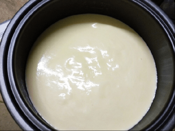然后需要准备一个电饭锅,将电饭锅刷洗干净后,再其底部刷上一层食用油,并把准备好的面糊,将其倒入到电饭锅当中,让面糊在锅中平铺均匀。最后只需把面糊上锅并开火,对蛋糕进行焖煮40分钟,一道香味十足的蛋糕,就可以出锅切块进行食用。