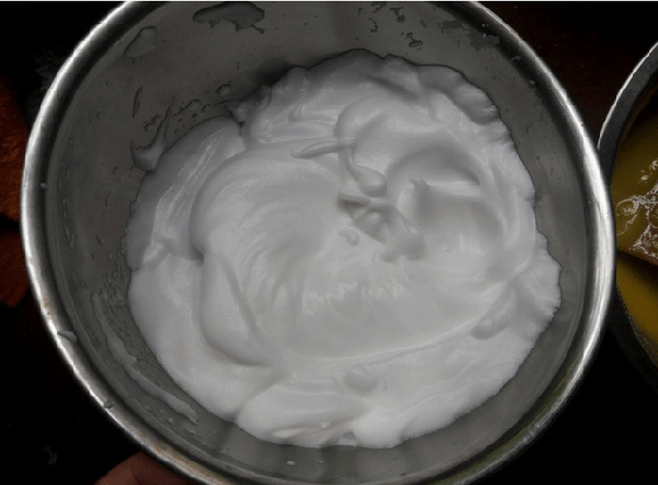 2、往面糊中加入蛋白时,不要采用搅拌的方式将其融合,而是用翻拌的方式,以免气泡消失。