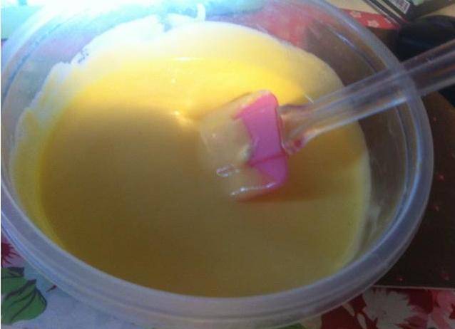 3、把调打好以后的蛋白,我们需要将其分三次加入到准备好的面糊当中,并用铲子将其和面糊翻拌均匀,在此步骤一定要记得要采用翻拌的方式,而不是用搅拌的方式。