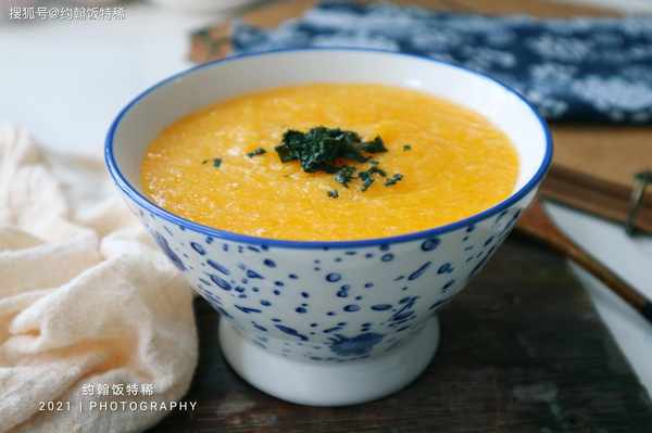 4:大火烧开后转中火一直熬煮到自己喜欢的浓稠度即可关火,山药南瓜粥盛入碗内,撒上一些海苔碎或者肉松就可以享用了。