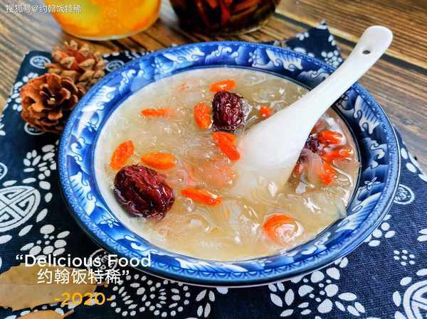 4:加入冰糖后用小火继续熬煮20分钟,期间要多次搅拌,这样也有助于快速出胶,汤汁变得粘稠。出锅前10分钟再把枸杞和红枣加进来,最后少放一点盐即可出锅。