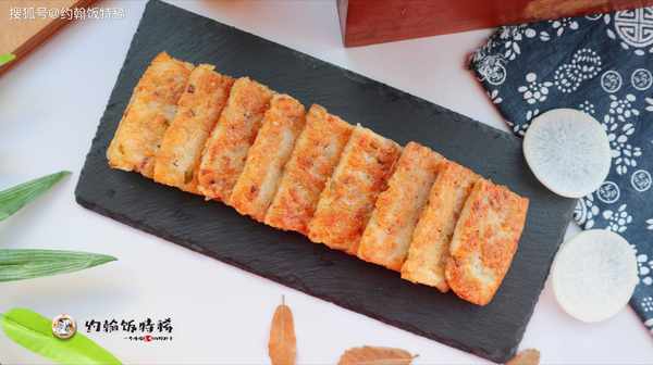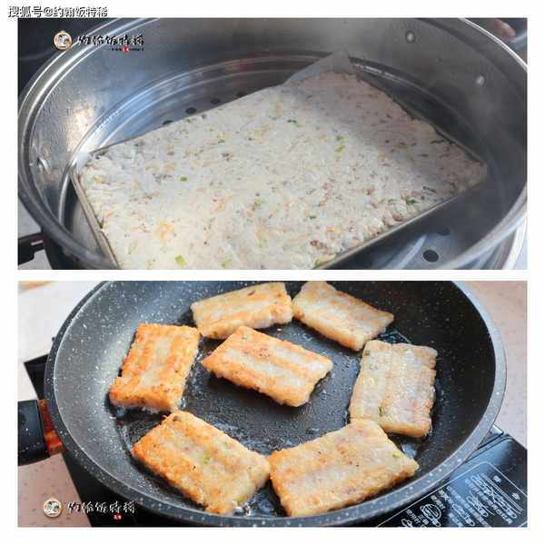6:将蒸好的萝卜糕取出,倒扣脱模,稍微放凉后切成厚度在1厘米,宽度在3厘米左右的萝卜糕片。